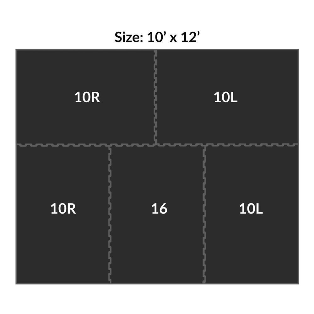 • This interlocking mat kit is made up of a total of 5 interlocking mats that measure 1/2" thick by 4' x 6'. These components interlock together to cover a 10' x 12' floor space. The included components are: